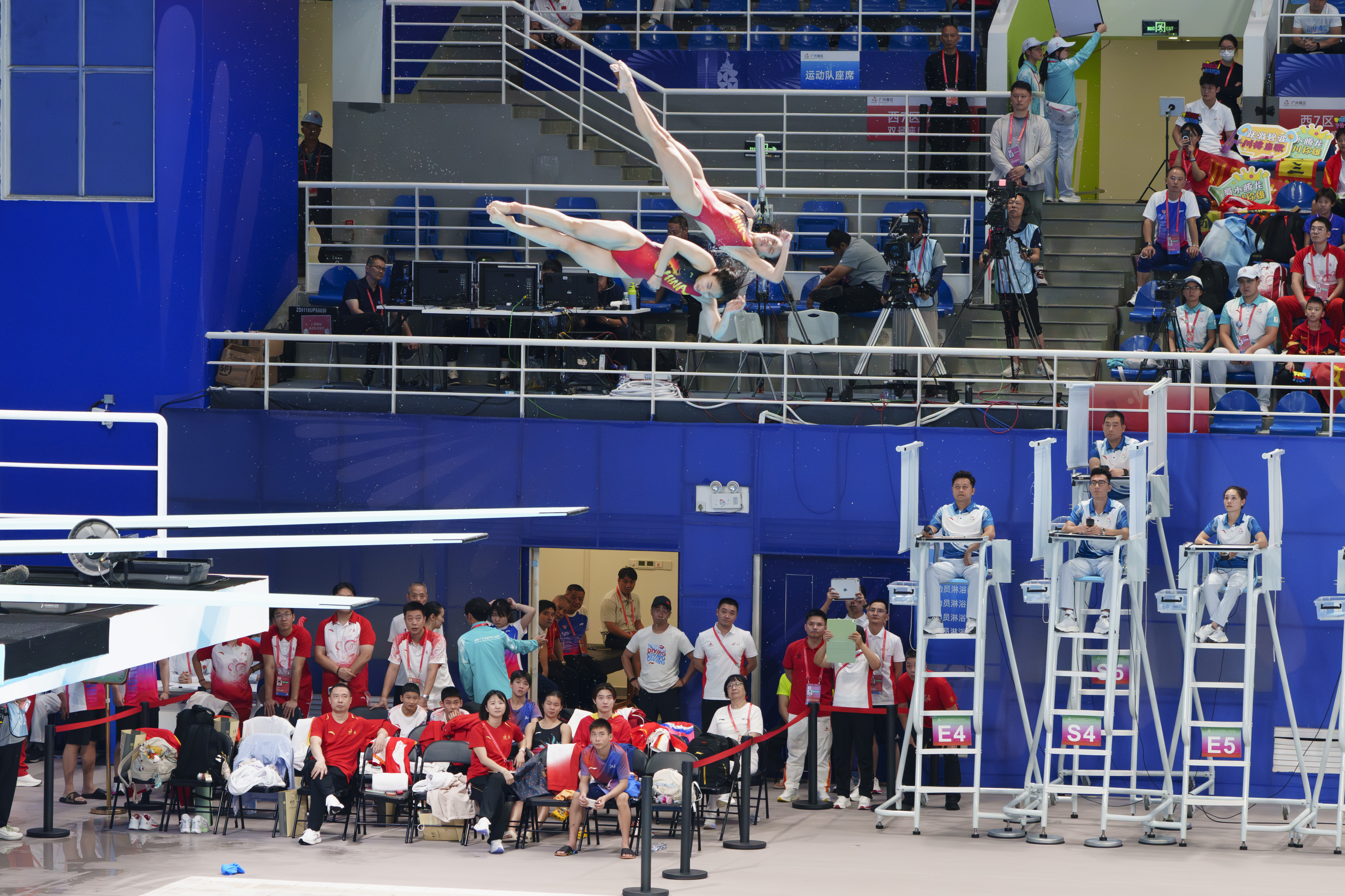 第二个女子团队项目代表四川队出战的是卢为和李蕊汐。作为跳水世界冠军,卢为展现出顶尖实力与良好的心理素质。她从第一轮开始便以72.00分并列第1。第二轮,她乘胜追击中利网,凭借难度系数3.2的动作再获76.80分,从而以148.80分的总分占据榜首。关键的第三轮,卢为愈战愈勇,作为全场唯一选择臂立向后翻腾三周抱膝的选手,以79.20分的高分巩固了领先优势。5轮结束后卢为拿下370.75分。